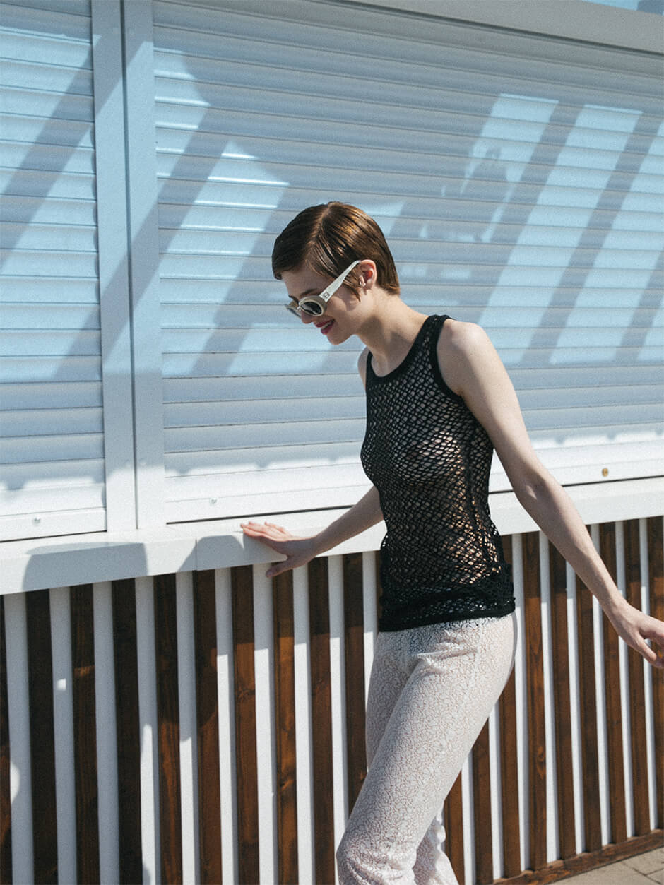 top by JENNYFER VINTAGE, trousers by CHELBAEVA, shoes by CUSTOMED BY DASHA, glasses by FENDI VINTAGE