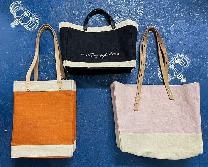 持ち手が本革のジュートのバッグはバングラデシュで生産。サステイナブルな米ロサンゼルスのブランド「アポリス」が生産支援する工場を使ったトートバッグで、感度の高さや作りのタフさ、買いやすい価格が売りだ。