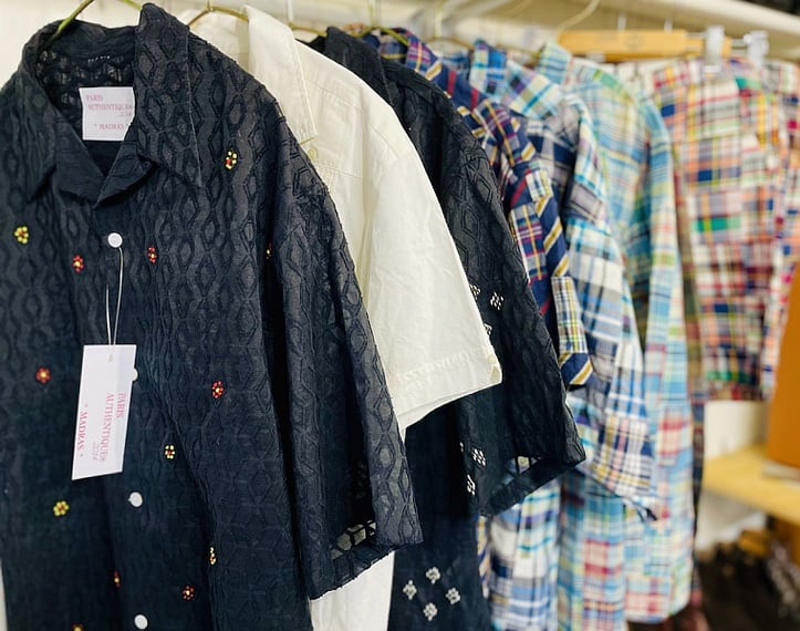 25年春夏物の布帛のシャツ、パンツ、ジャケットは、有名な米国ブランドも使っている南インド・チェンナイ(旧マドラス)の工場で生産する。赤やブルー系のパッチワークのマドラスチェック、ジャカードに、手刺繍を施した物など、全体的に懐かしい雰囲気。前立てが途中までのハーフプラケット仕様のシャツもある。