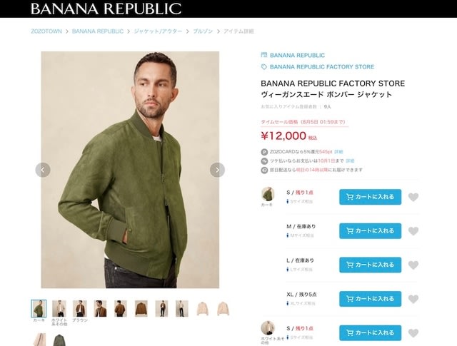 8月も下旬に入ると、ネット通販各社から秋冬物のメルマガなどが届く。先日もZOZOTOWNから「BANANA REPUBLIC FACTORY STORE」のタイムセール情報が届いた。商品名には「ヴィーガンスエード ボンバージャケット」とあった。販売元がファクトリーストアとあるので、秋冬物の売れ残り在庫だと思われるが、シーズンに入れば売り切れるかもしれないので、「先買いした方がお得ですよ」とのレコメンドだろう。プロパー価格や割引率の表示がないので、正確なところがわからないが。