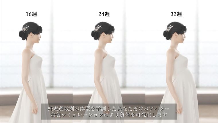 今年5月には、ビネット&クラリティと共同でデジタルフィッティングルームを開発しました。試着時と挙式時では、妊婦の体形は変わります。挙式当日の自分の姿をイメージしにくいことは課題でした。ラナチュールが蓄積した妊婦の体の変化のデータを基に、試着時の体の状態からデジタルの力で予測してアバターを作成します。変化した体形でのドレス姿を様々な角度から見ることができ、ドレスを選びやすくなりました。また、着用時の体やおなかの赤ちゃんにかかる負担も、シミュレーション機能で可視化できます。