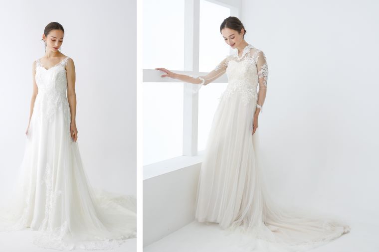 そこで1000人以上の妊婦の体のデータを基に、ドレスのパターンを開発しました。ウエストの高い位置で自然なくびれを作る設計で、体にフィットした美しいラインが実現します。おなかが大きくなる妊娠後期でもAライン、プリンセスライン、ソフトマーメイドなど好きな形を無理なく着用できます。おなかの膨らみはレースやチュールを生かした立体的なデザインで目立たないようにしたり、スッキリしたシルエットであえて見せたりと、様々な要望に応えます。150着近くの選択肢を揃え、独自のパターンは次世代に引き継ぐ基盤を作るために特許を取得しました。