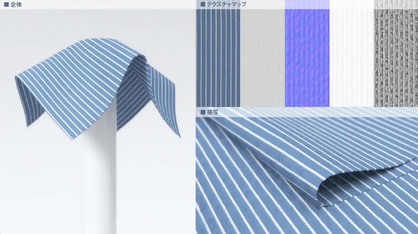 「デジタル生地データとは、生地の質感を表現するテクスチャー(画像)データと物性データを組み合わせてデジタルで再現した生地です。