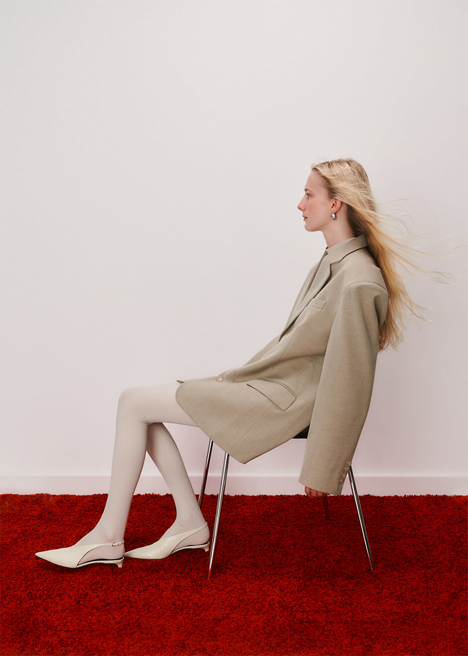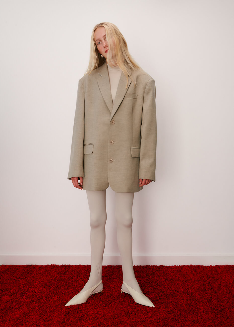 jacket by FRANKIE SHOP, top and tights by CRITTER, shoes by JIL SANDER, earrings by BY PARIAH, bag by PRADA