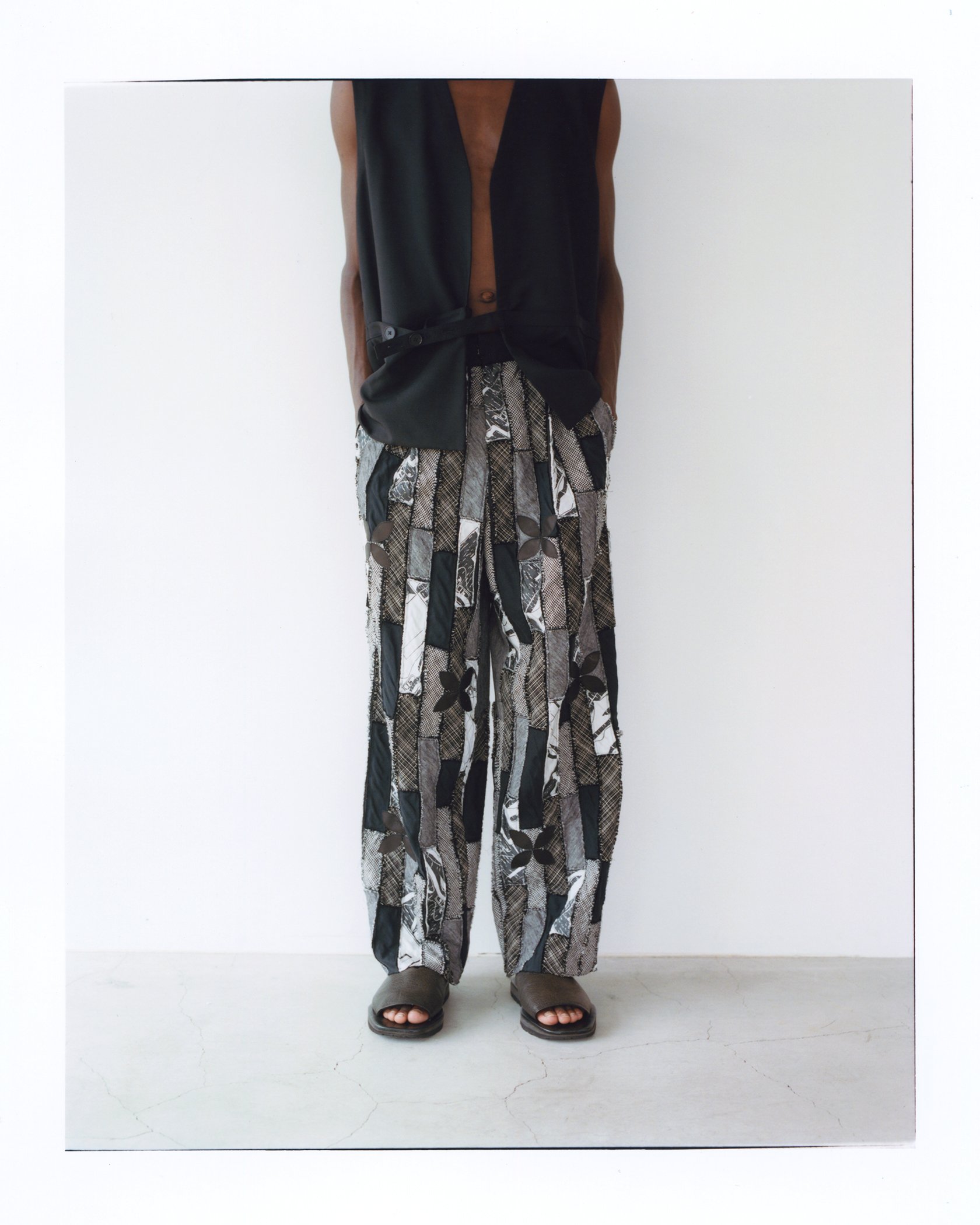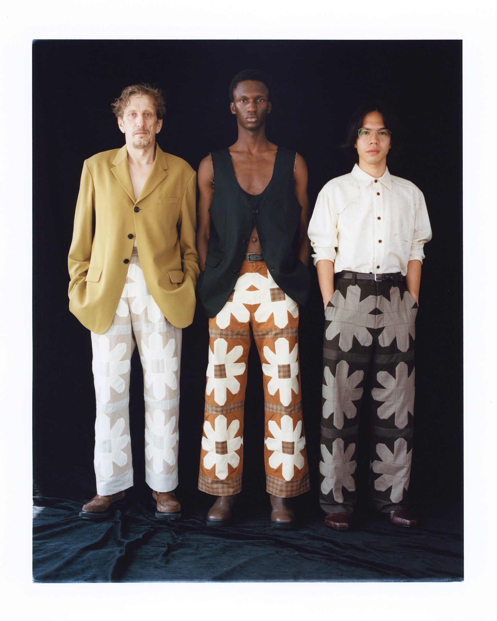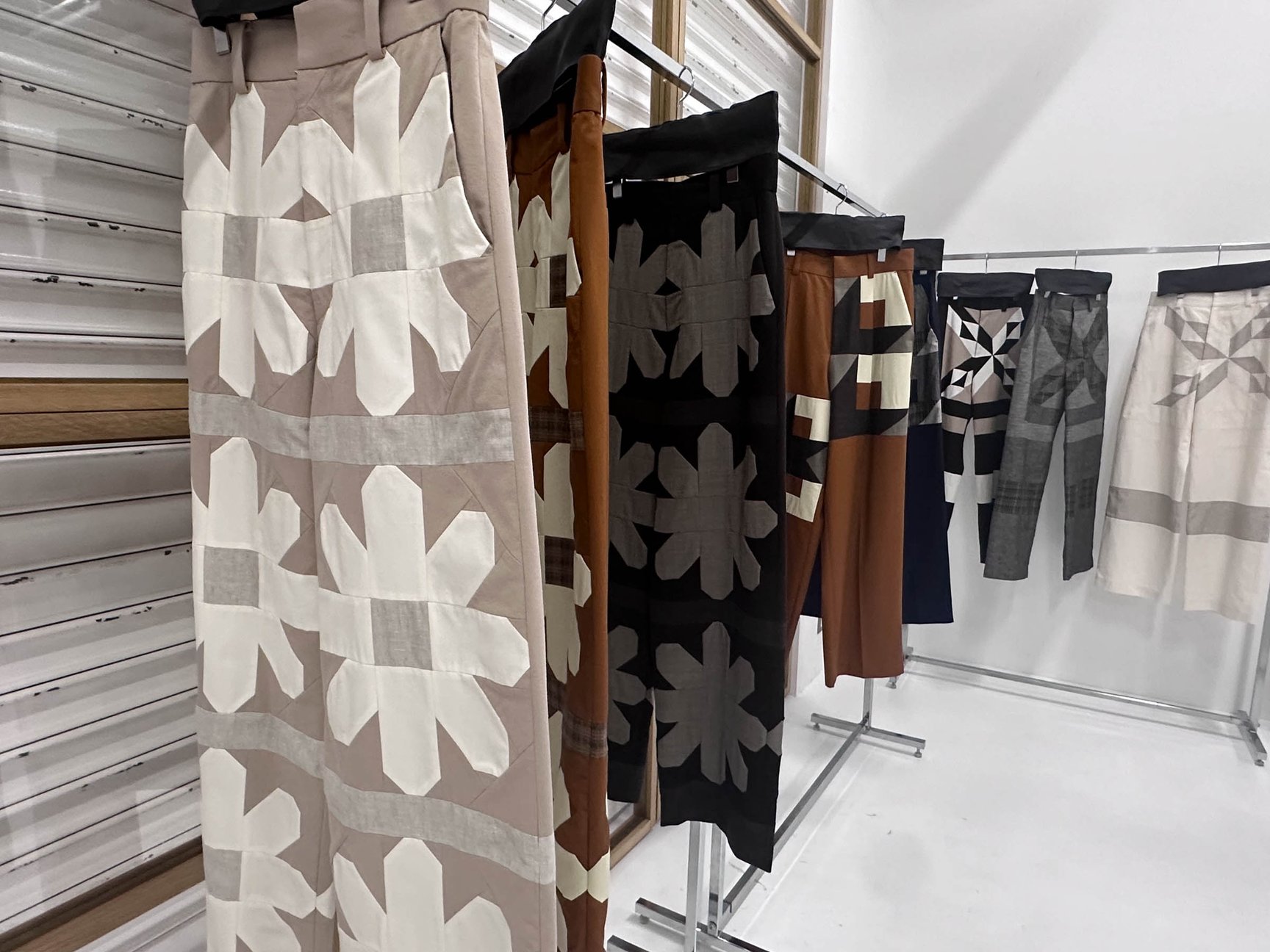 テキスタイル工場に眠る希少なアーカイヴやデッドストック生地を活用し、スポメニックの独特な建築構造デザインに着想した幾何学的なパッチワークでデザインを展開。生地の組み合わせや柄のアプローチによって新たな解釈を加えて、ソフィスティケートされながらも素材そのものの“上質な野暮ったさ”をミックスすることで、時代が変わっても新しさを感じるものづくりを追求している。