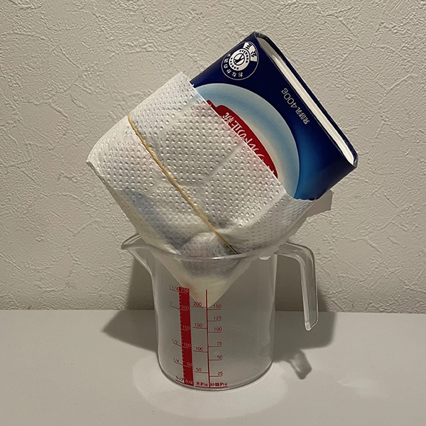 ②ヨーグルトをよく混ぜ、キッチンペーパーを2枚重ねて上の部分に画像のようにかぶせたら、輪ゴムで留める