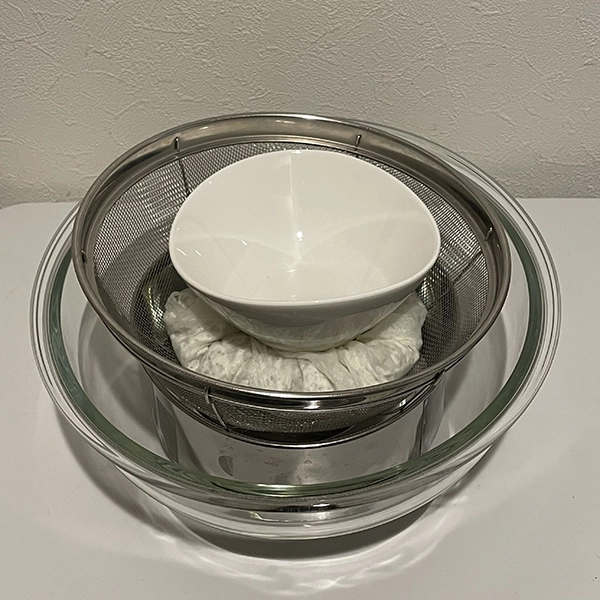 ①市販のヨーグルト、ザル、ボウル、重石を用意する