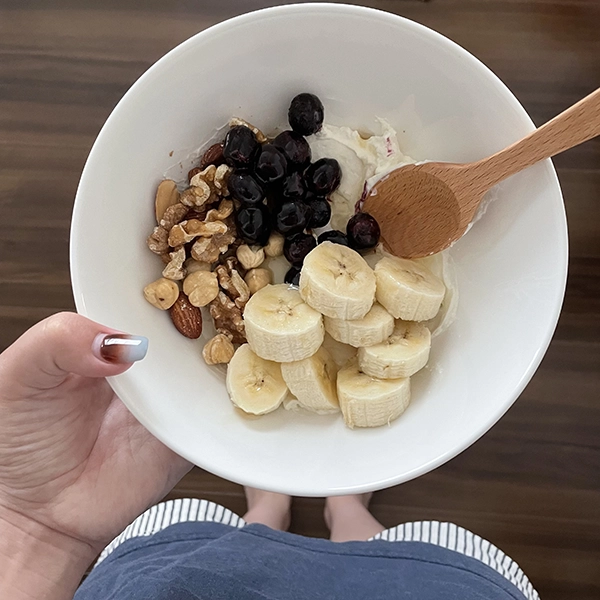 クルミなどのナッツ類、バナナ、ベリーなどをお好みでのせて、ハチミツをかけたら朝食にぴったりなヘルシーグリークヨーグルトの完成です。