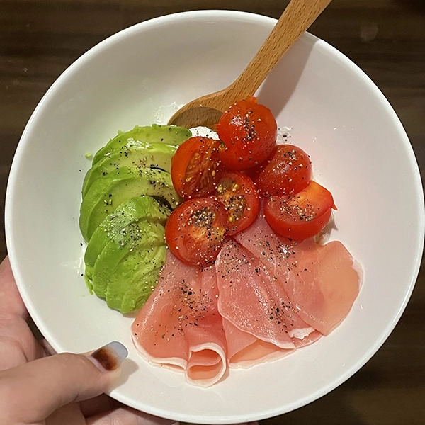 アボカド、生ハム、ミニトマトをトッピングして、オリーブオイル、ブラックペッパーなどをお好みでかけたら、イタリアン風なグリークヨーグルトアレンジのできあがり。