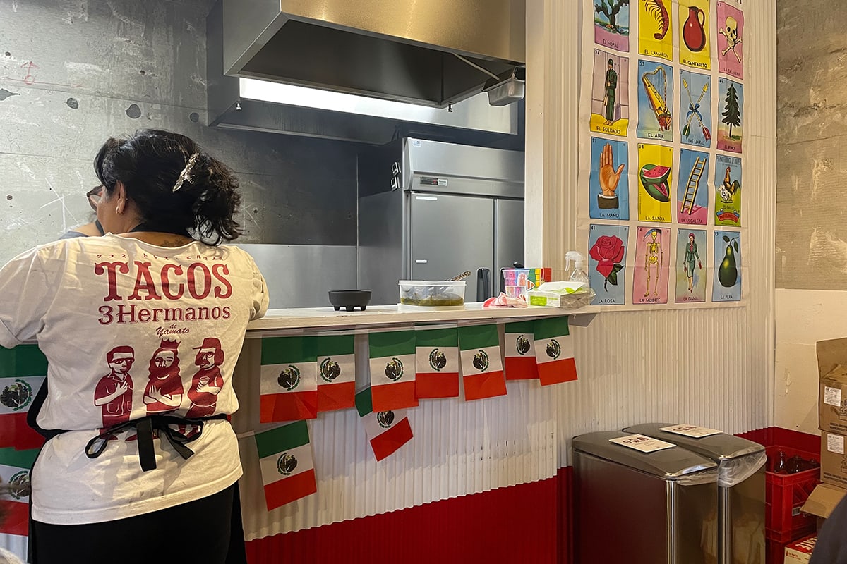 店員さんも着用の「Tacos 3Hermanos」オリジナルTシャツ(店内にて販売中)