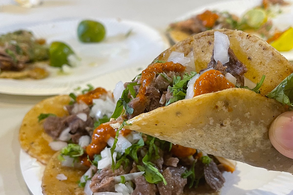 さっそく頂きます!1つ持ち上げると、たっぷりの具材が今にもこぼれ落ちそう。勢いよくかぶりつくと、大きめにカットされたハラミのがっつりジューシーな旨みが口いっぱいに広がっておいしい。サルサロハ(赤いソース)のダイレクトな辛さでビールも進む。