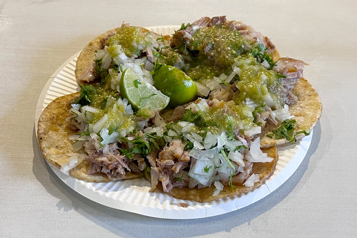 本場のしびれる辛さを堪能したあとは、こちらの「カルニタス」でお口の中をさっぱりと。メキシコでは食用で出回る”ほおずき”(日本では毒のあるものが多い)を使用した、たっぷりのサルサヴェルデが甘酸っぱく、パクパク食べられる。お子さまにも人気のメニューだとか。