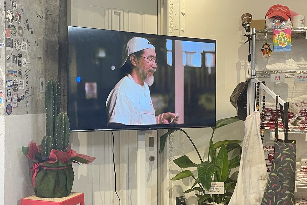 店内では「Tacos 3Hermanos」のドキュメンタリーショートフィルム「タコスって愛だ」を上映中。