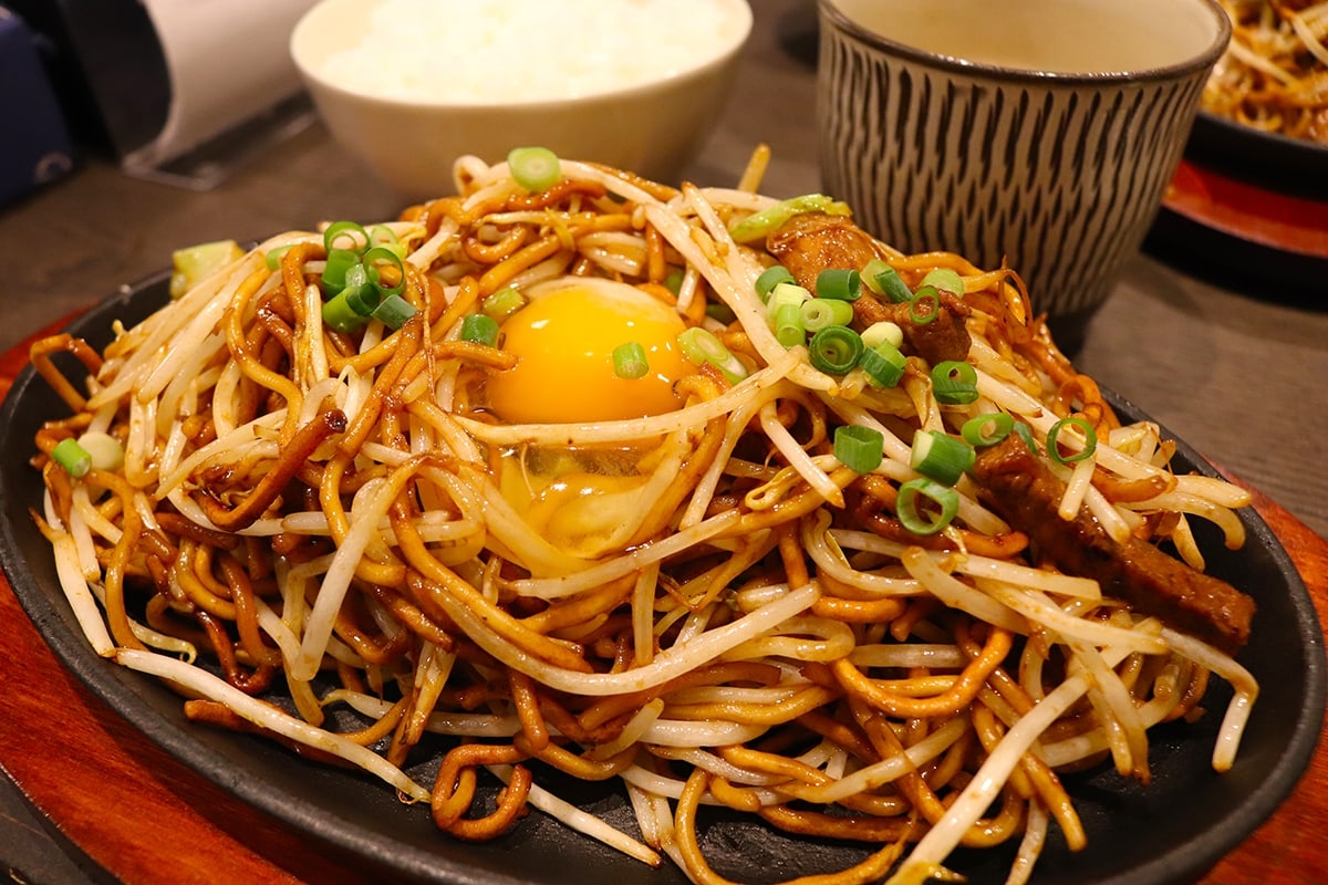 古着屋ベルベルジン(BerBerJin)のオーナーの地元である大分県日田市名物の「日田やきそば」が味わえる「来々軒」。生卵を乗せるのがスタンダードなのだそう。鉄板でじっくり火を通したパリパリ部分と、熱湯でさっと茹でられたモチモチ部分が混在する麺に濃厚ソースが絡む、病みつきの逸品です!