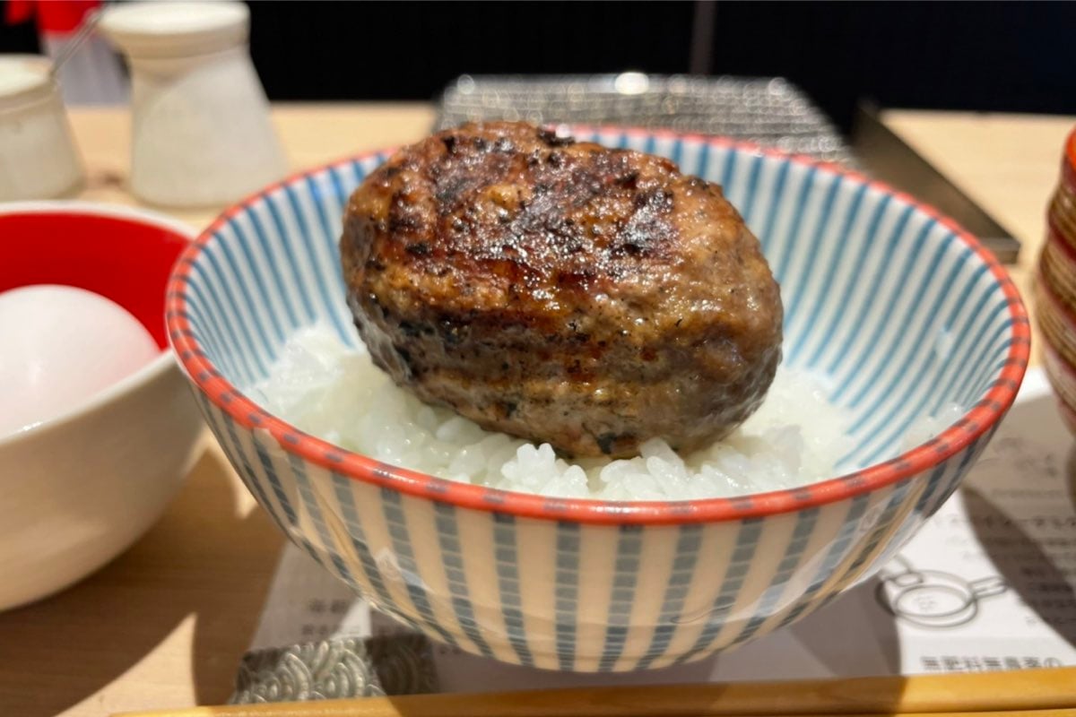 粗挽きハンバーグ3つを生卵や薬味で贅沢に…