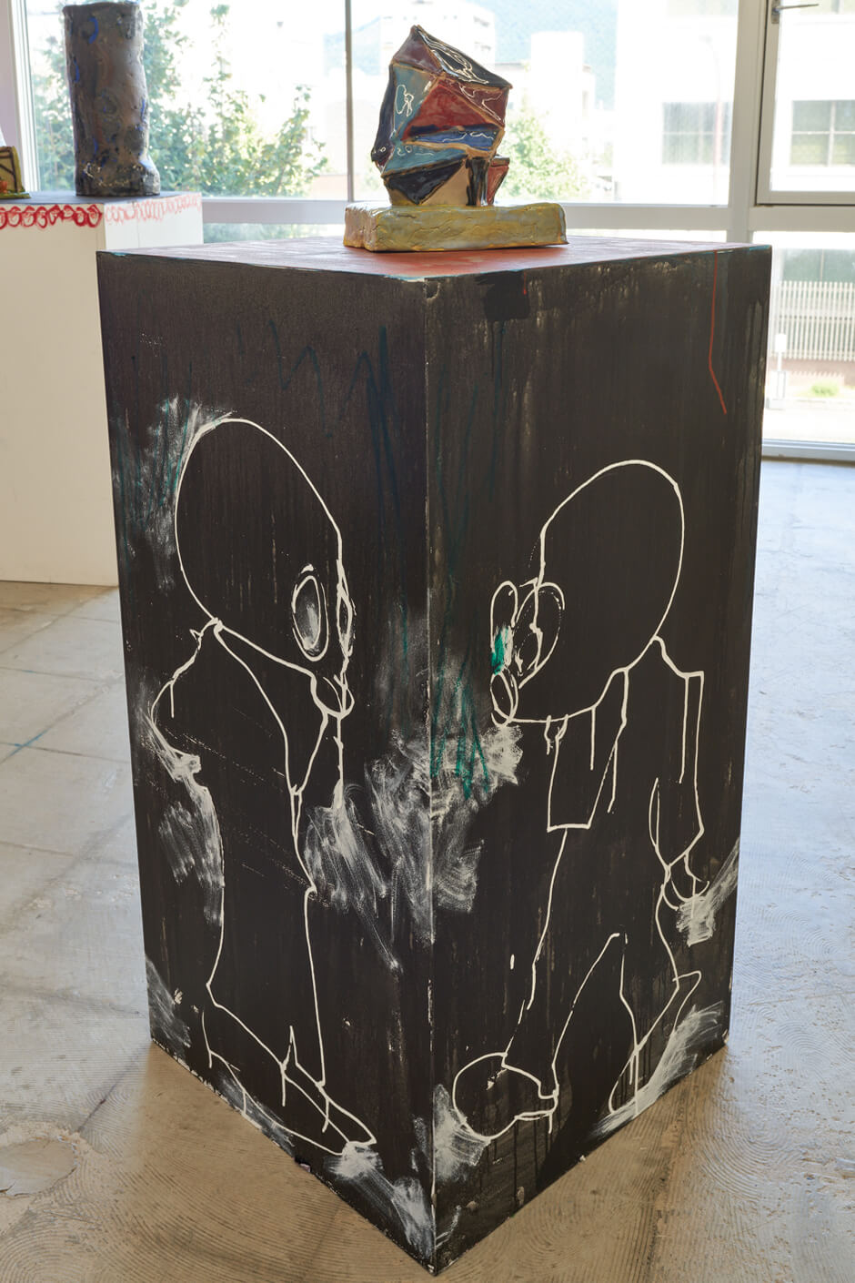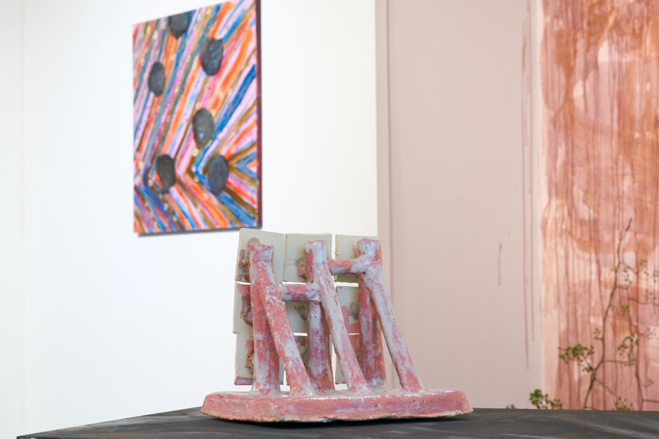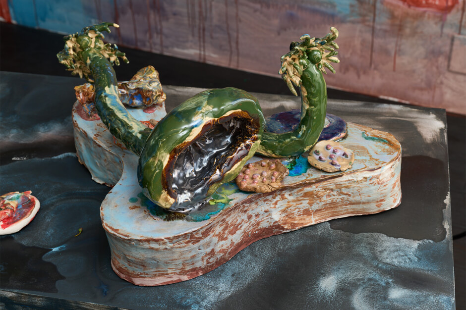 ホウキ、浜辺で見つけた木々やプラスチック、古びたおもちゃなどの素材と陶芸を組み合わせ、紙芝居やコメディア・デラルテ(仮面を使用するイタリアの即興劇)のキャラクターを引用するなど、知的でユーモアあふれる世界を作り出す。
