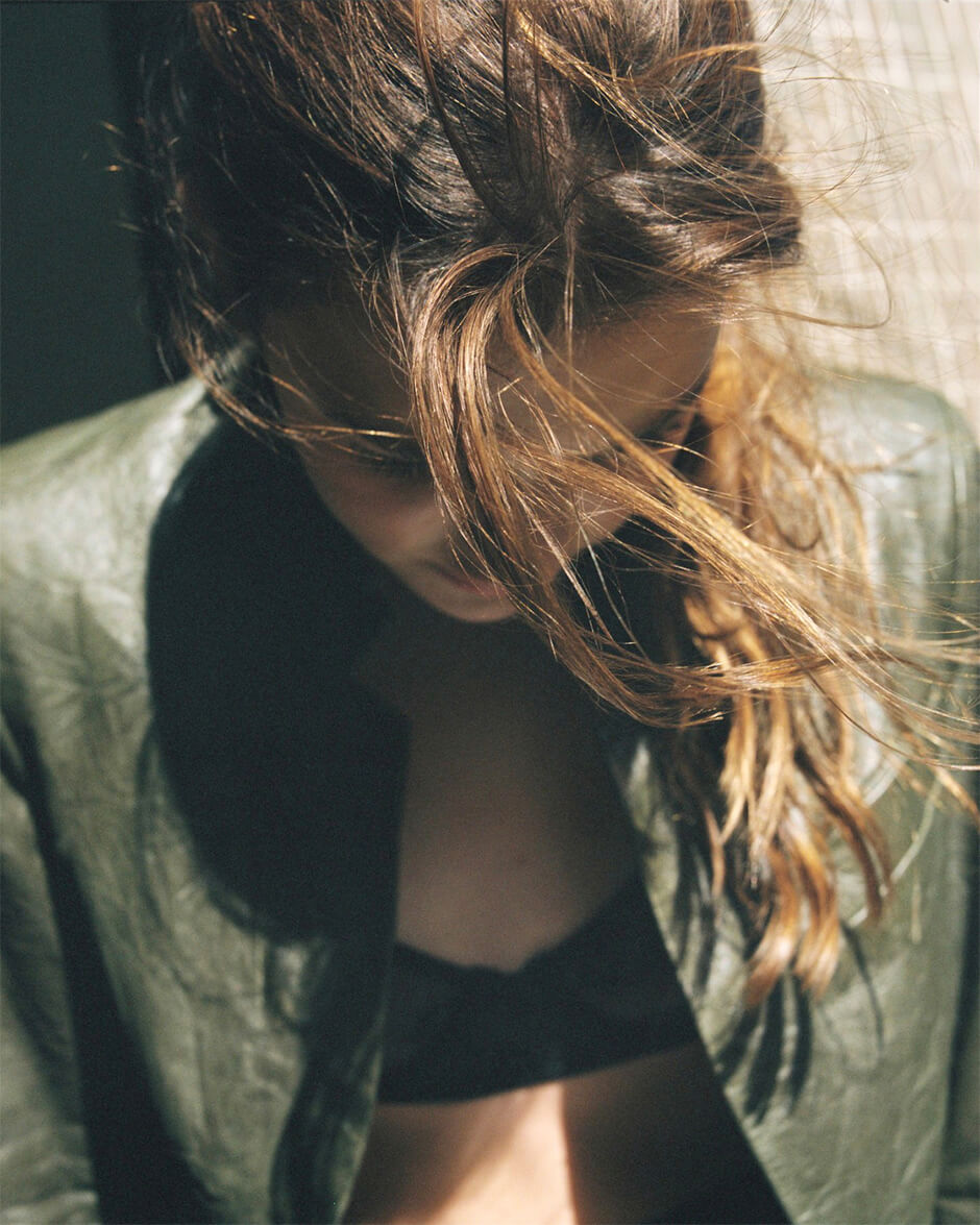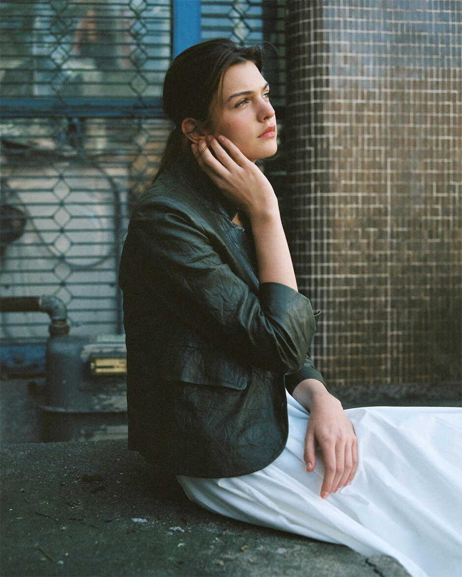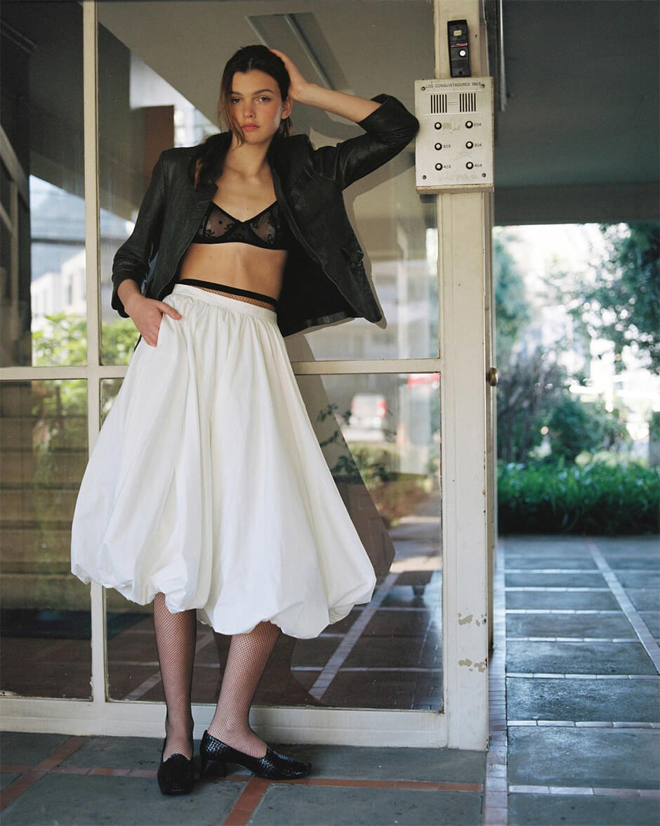 jacket by ZADIG VOLTAIRE, bra by TORU AND NAOKO, skirt by TRINIDAD STUDIO, shoes by MIISTA, tights stylist's own