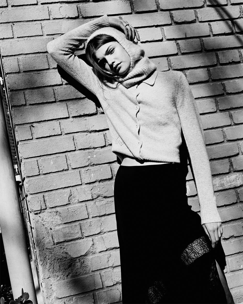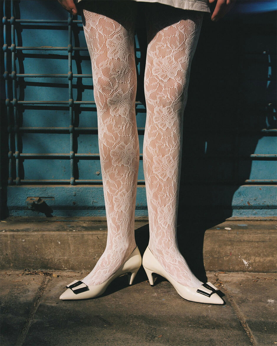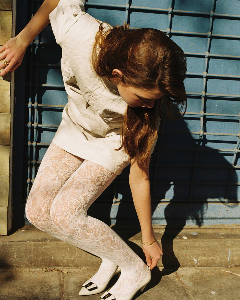 jacket by ZADIG VOLTAIRE, bra by TORU AND NAOKO, skirt by TRINIDAD STUDIO, shoes by MIISTA, tights stylist's own