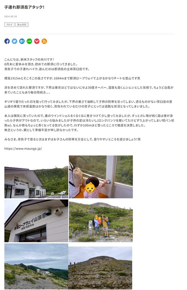 その他、スタッフによる登山や渓流下りなどのアウトドア体験記を中心としたブログも掲載。アウトドア好きのスタッフによる本格的な体験記を通じ、適したアイテムや、おすすめのレジャースポットを知ることができる。