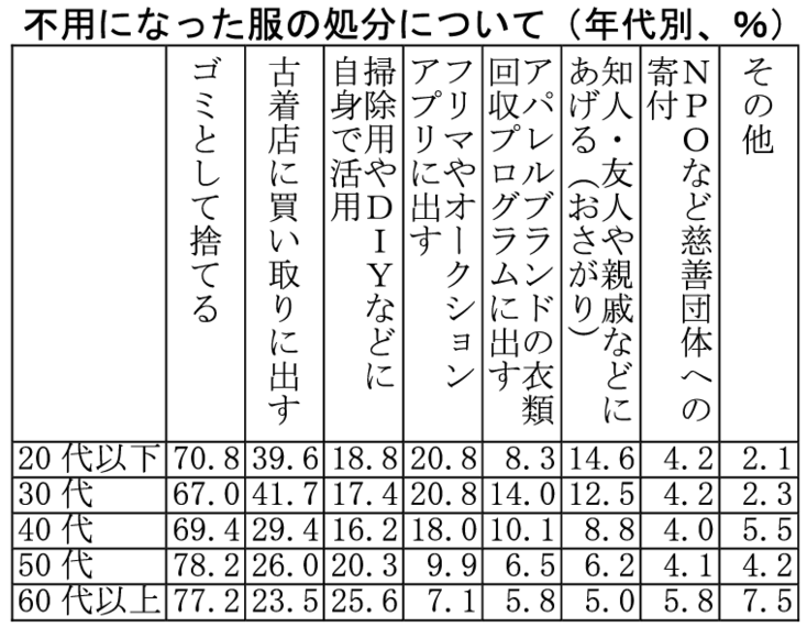 不用になった服の処分については「ごみとして捨てる」が突出して多く、全年代で最も多かった。若い世代ほど古着店やフリーマーケットに出す人が多かった。「古着店に買い取りに出す」は20代以下39.6%、30代が41.7%と4割を占めた。