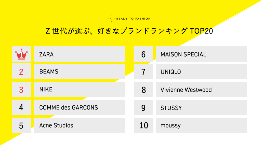 ファッション・アパレル業界に特化した求人サイトを運営する「READY TO FASHION」は、「READY TO FASHION」に登録しているZ世代(1996年〜2012年生まれ)ユーザーのプロフィールを分析し、好きなブランドをランキング形式で発表します。