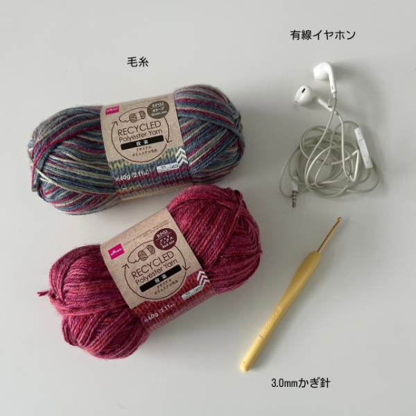 材料は、全部で3つ。今回は、毛糸とかぎ針は「DAISO(ダイソー)」で購入し、有線イヤホンはAppleの純正イヤホンを使用しました。