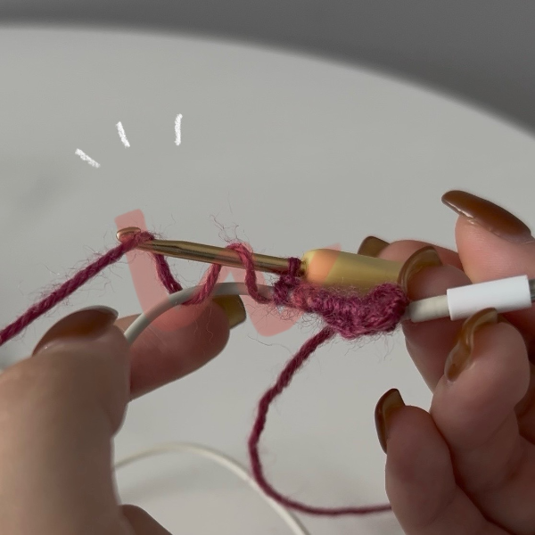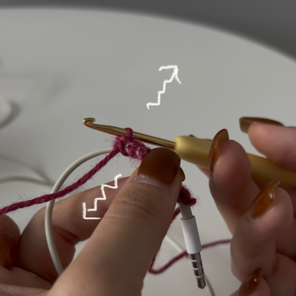 Step 1:かぎ棒とイヤホンに「W」形に糸を絡める