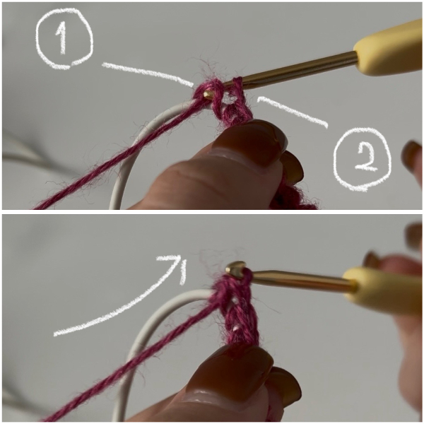 Step 2:“かぎ”に糸をひっかけ、[Step1]でつくった輪の中を抜く ※輪は2つあるよ