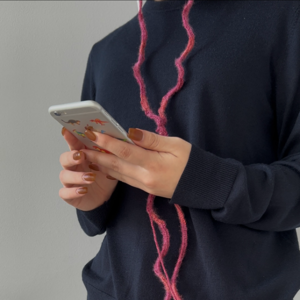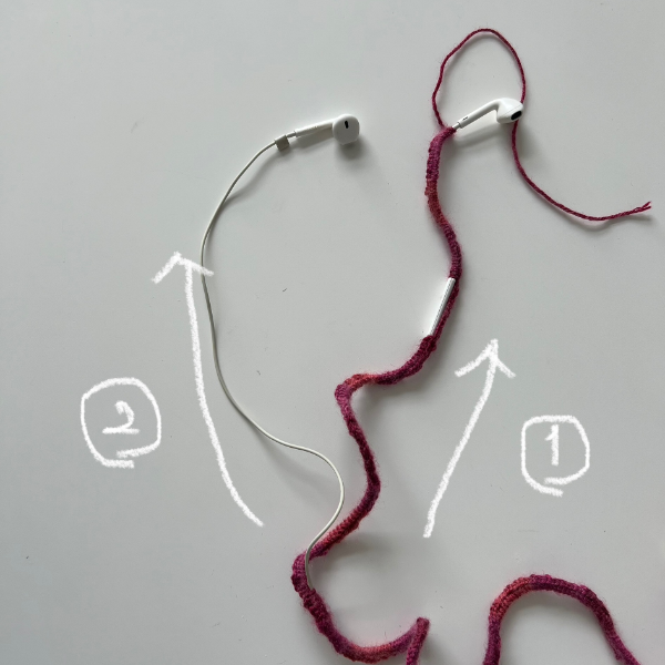 有線イヤホンに纏わせるように毛糸を編むことで、まるで毛糸でできたイヤホンのように見えるアイデアです。