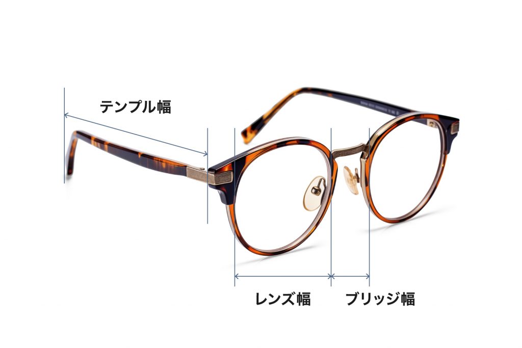 メガネのレンズ1枚分の横幅のことで、顔の幅に合わせて選びます。目安は成人男性で52〜56mm、成人女性で50〜54mm。メガネをかけた際にレンズの中心部分に瞳の黒目が位置しているかどうかが判断基準となり、メガネを通して顔を見たときに寄り目になっていればレンズ幅が大きすぎ、離れていればレンズ幅が小さすぎるということです。