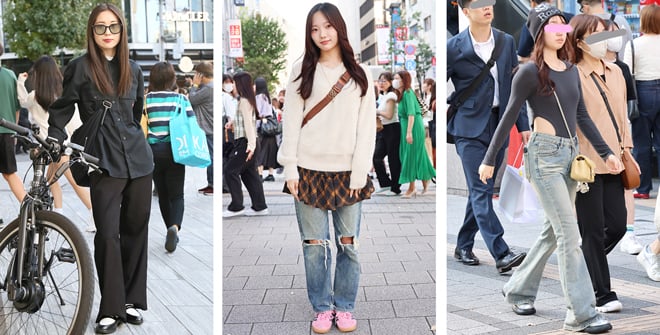 W浅野、特に浅野ゆう子のようなソバージュヘアがトレンディだった1990年、梨花のようなエアリーなウェーブ感のロングヘアが主流だった2007年。2024年のロングヘア人気を牽引するのは、やはり韓国の女性アイドルたちと言えそうです。2022年にデビューしたNewJeansは当時全員がロングヘア。定点観測でもたびたびその名が上がるBLACKPINKのジェニーもロングヘアがトレードマークです。なかでもピュアさと強さを感じさせる前髪のないストレートのロングヘアが今年は台頭。基本的には艶のある黒髪ですが、パキッと明るい金髪なども散見されます。三つ編みやハーフアップなどのアレンジ、あるいは先月(2024年9月)の定点観測で注目したヘッドアクセサリーをプラスしたスタイルも少なくありません。ロングヘアは黒やグレーを中心としたモードな装いとも好相性で、クールでミニマルな装いも目につきました。またインタビューでは「ダンスをするときロングヘアのほうがきれいに見える」という意見もあがり、ダンスが日常に浸透した世代ならではのマインドも垣間見えました。