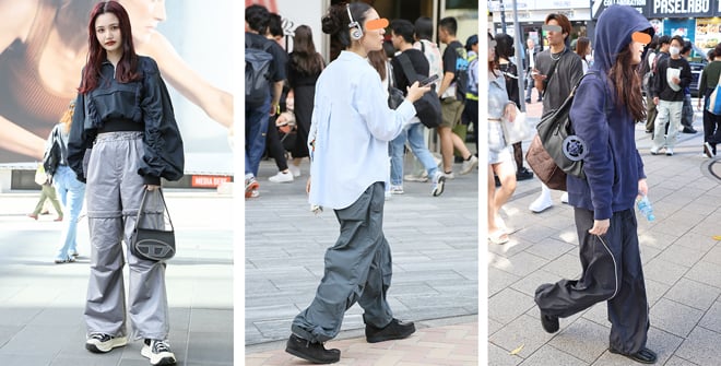 (左)「今日のパンツはドローコードでシルエットを変えることができて、ショートパンツにもできます。変化、アレンジができるので買いました」と話してくださった26歳の女性。パンツはLITMUSで購入したKISHIDAMIKIのもの。(中)ミリタリーディテールのナイロンパンツが目立つ今シーズン。裾にベルクロやドローコード、ゴムなどで自由にシルエットを調整できるのが人気のポイント。(右)この日新宿で非常に多くみられたのが、パイピングデザインのナイロンパンツ。フードかぶりやタビシューズでアンニュイなモード感をまとったスタイル。