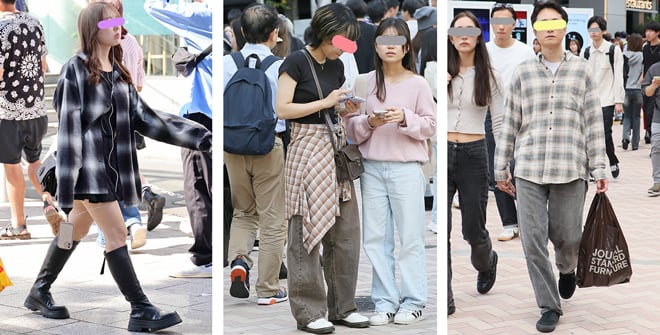 (左)20214年6月に「チェック柄アイテム」を取り上げた際にも人気だったオンブレチェックのシャツが秋を迎えてさらに着用者層拡大。なかでも黒やネイビーなどダークトーンのものが人気。(中)男性のスカートレイヤードスタイルがじわじわ増えているなか、シャツの腰巻もボトムスのレイヤード感覚で取り入れられているようだ。(右)春から人気のグレー系のパンツ。色落ちブラックデニムも加わり人気継続中。合わせるトップスもグレー系のチェックで全身をワントーンにまとめるスタイルが今秋風。