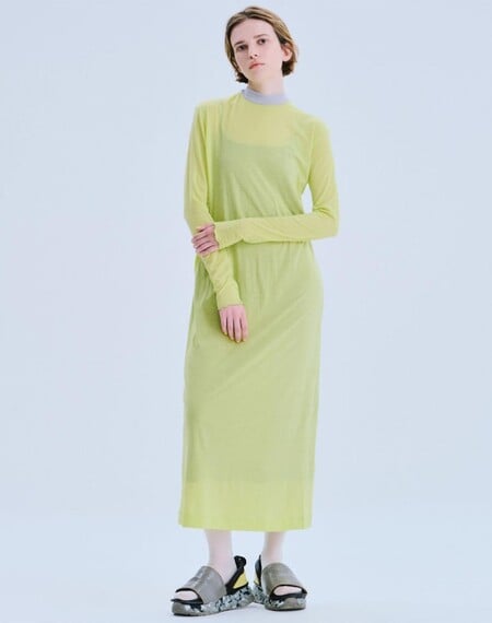 アイテムは他にガーゼテレコのロンTとワンピース、ウールヘリンボーンのワイドパンツがある。ハイゲージコットンカシミヤとガーゼテレコは生機が手に入ったため、高級服地に多い白や黒は避け、ライムイエローや紫、「ニュアンスの出るグレー」を揃えた。