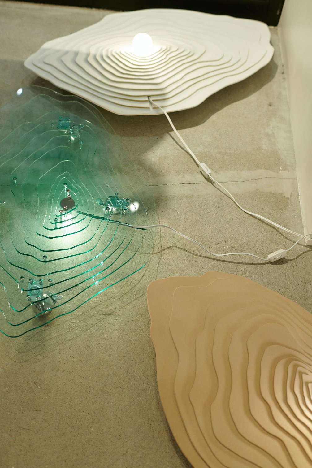今回のポップアップでは、大野が「初心に戻り、服だけにとらわれずに自由に新しいものを作ってみたい」との思いから全てハンドメイドで手掛けたという、一点物の「ライト」も初披露。2023年春コレクションで登場した「people concerned about acne」や、地層をモチーフにしたデザインを多様なカラーや素材で表現した。