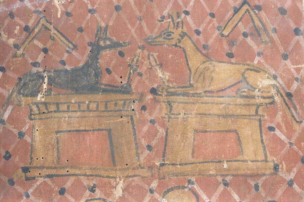 会場では、エジプトのネクベト神やアヌビス神をあしらったテキスタイルなどを紹介しています。