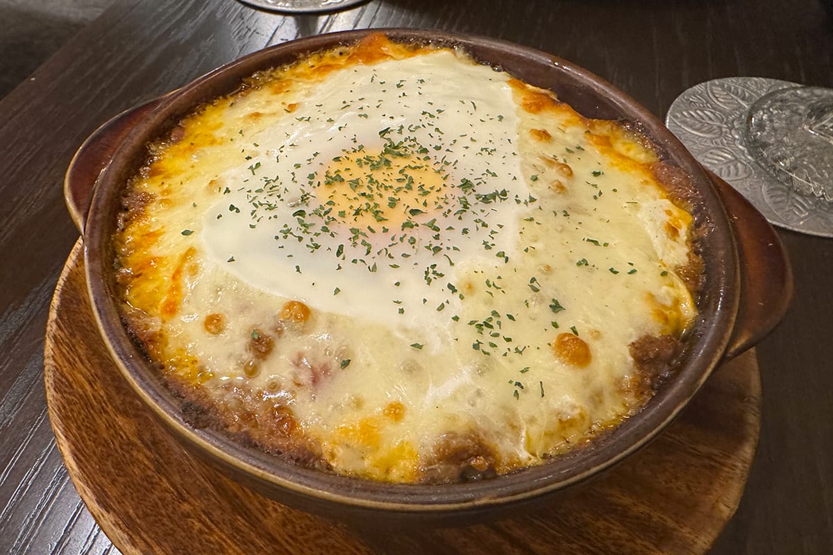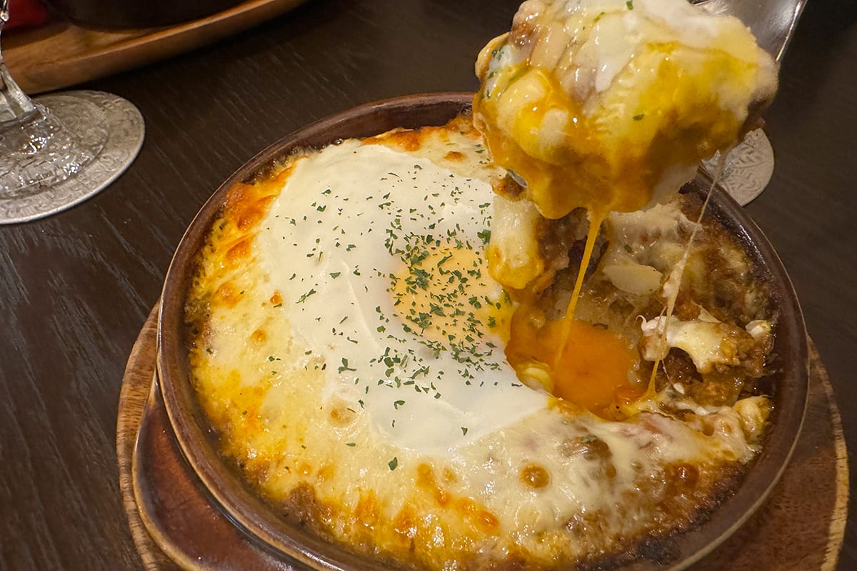 旨味たっぷりのチーズのコクが先行し、そのあとしっかりとカレーのスパイスがやってくる。スプーンのひとすくいのなかで、おいしさの味変が楽しめるというわけ。極め付けに卵をおとしてあって、これまた最高!写真で見えるよりもとろとろの半熟になっていて、スプーンを入れれば黄身がとろりと広がって、味に深みを与えてくれる。絶品だ。