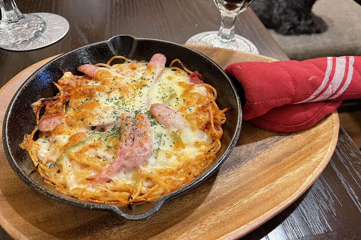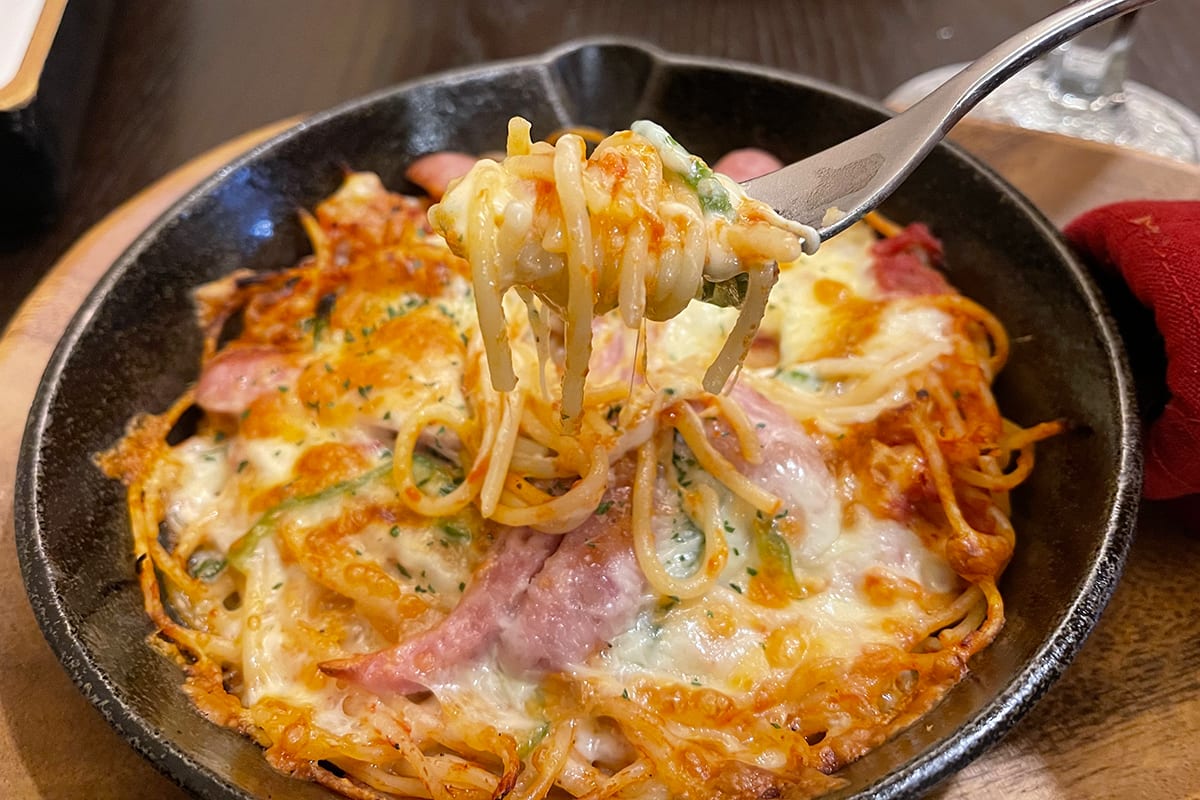 お次は同行した編集部員がオーダーしたナポリタン!こちらはスキレットの鉄板に乗って、チーズがたっぷり熱々に仕上がっている。