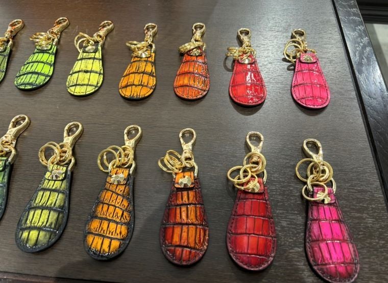 レザーグッズはワニ革の財布やスマートフォンケース、ベルトなど。俳優から依頼を受けた台本カバーなど、変わり種の仕事もあった。数十万円の商品もあり、人とかぶらない商品を求める客からの注文が絶えない。「ワニ革は富裕層人気が高い。丈夫で長く使えるのも魅力だ」と話す。