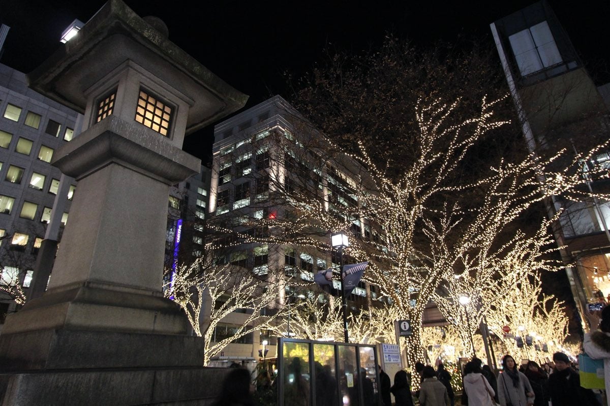 編集部撮影(2017)1945年(昭和20年)の山の手空襲を経て、今も残る表参道の歴史ある灯籠と、平和を象徴するようなイルミネーションのコントラストもここでしか見られない特殊な景観だろう。