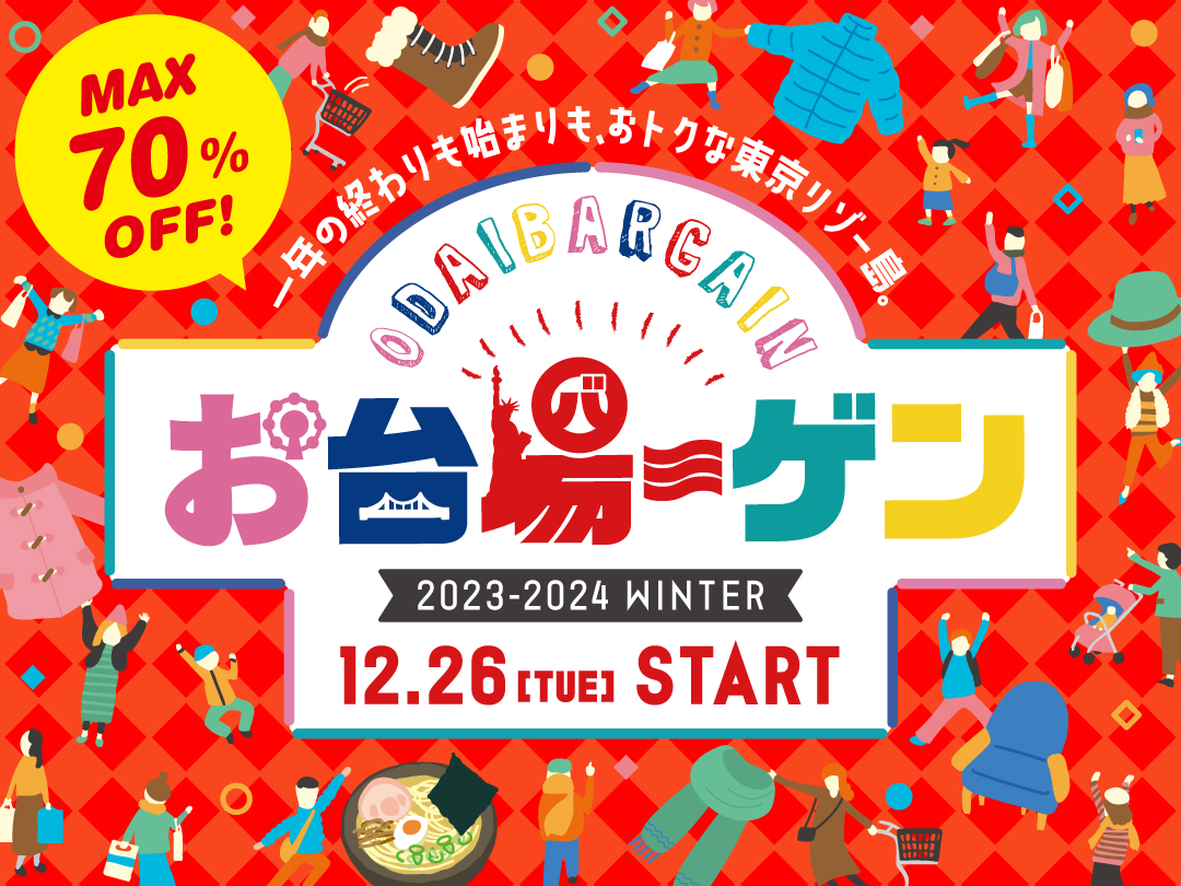 アクアシティお台場は初売りに先駆けて、最大70%オフの「お台場ーゲン」を開催中。アウターやスニーカー、帽子などの冬のファッションアイテムから雑貨まで、幅広いアイテムがプライスダウン。「トミー ヒルフィガー(TOMMY HILFIGER)」「ラコステ(LACOSTE)」「リーバイス(Levi’s®)」「レイバン (Ray-Ban)」などが参加しています。