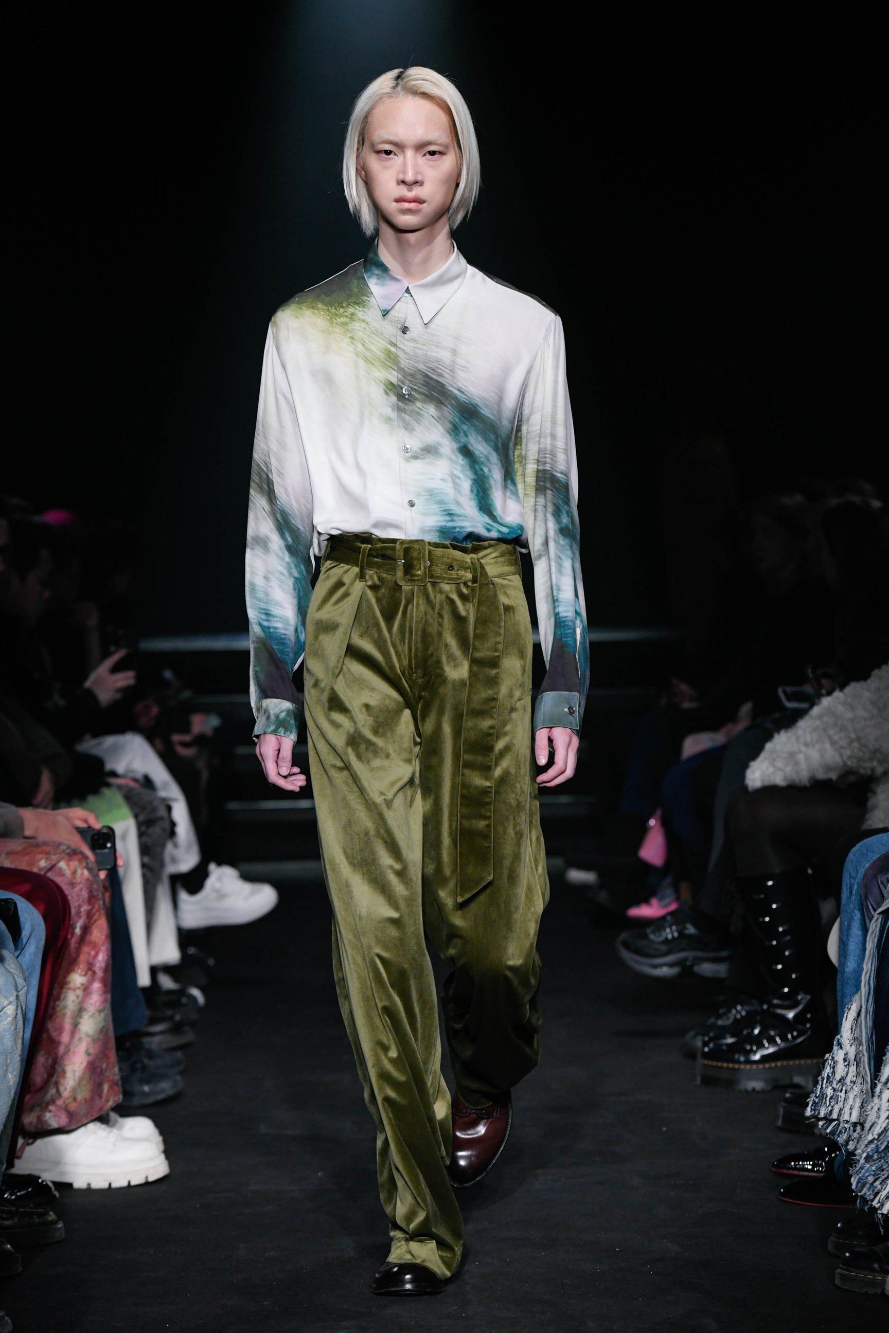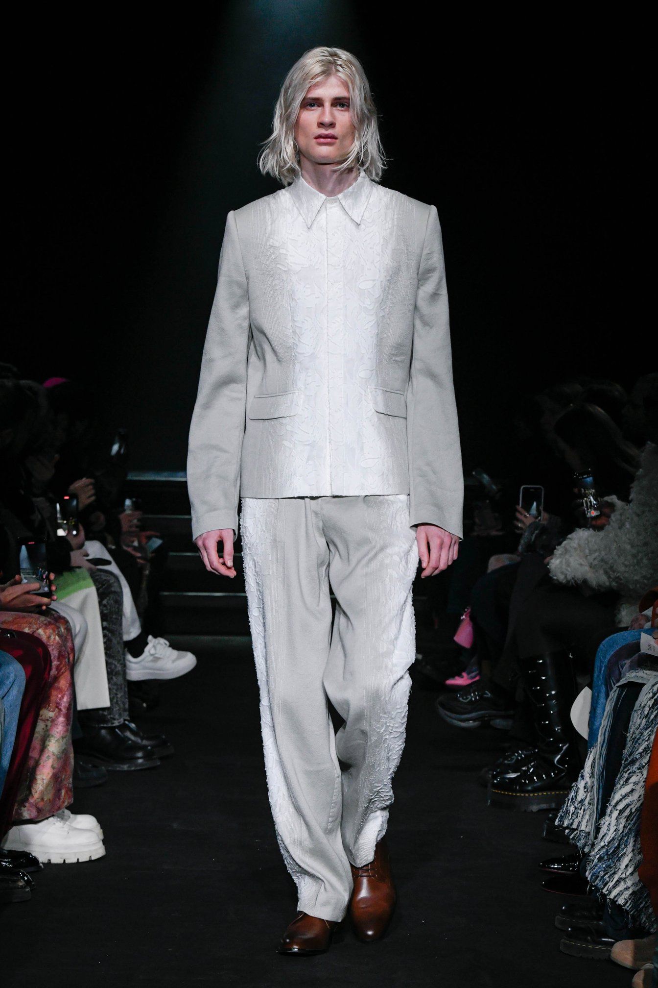 今コレクションの会場となったのは、パリ18区に位置するモンマルトルの丘の麓にある劇場、「ル・トリアノン(Le Trianon)」。来場者を暗い照明のホールに招き入れ、舞台を覆い隠していた赤い幕が開くと、純白のルックをまとったモデルが繰り出してきた。正確には、淡いグレーと白だったが、ライトグレーのテーラードジャケットの胸元から下方は、繊細なレースのシャツにグラデーションで切り替わっており、タークの代名詞的なこの特殊加工は、服の境界だけでなく、本来の色彩感覚をも曖昧にさせていた。ミニマル志向は今シーズンの大きな潮流であるが、なるほど、シンプルなデザインであればあるほど、素材の面白さとテクニックは自ずとその存在を雄弁に語る。そして、合わせられたフリル仕様のタキシードシャツが、ルックの静謐さを引き立てていることに気がつくと、その“シンプル”は緻密な計算の上で成り立っているのだと実感できる。