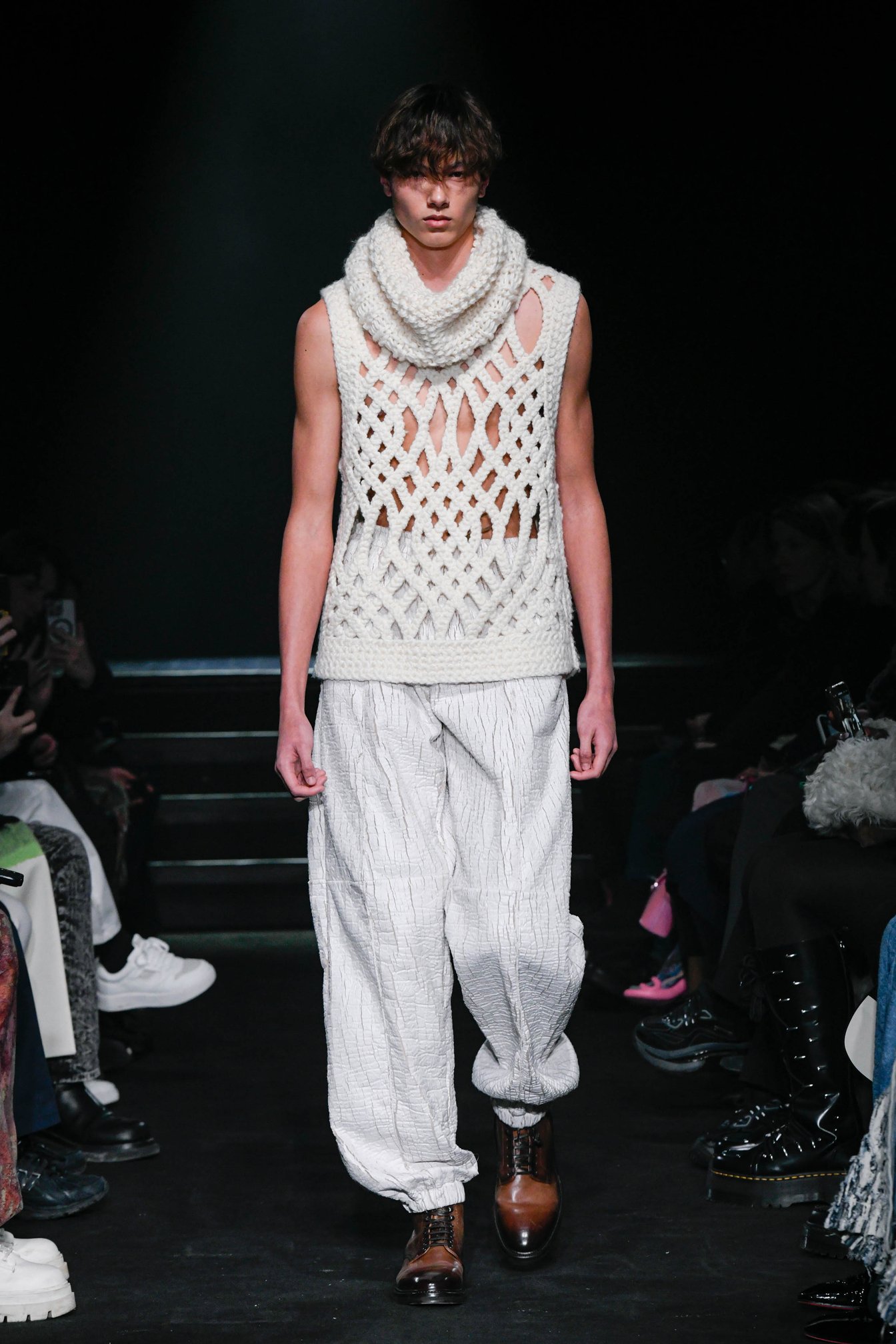 セカンドルックでは、水平方向にシャツとジャケットが移り変わっていく。その後、ヴィンテージデニムの経年変化を柄として織り込んだ定番のデニム素材は、らせんを描くスリーブのコートとして登場。幾何学模様のような網目の大きな鍵編みニットベストは、ひび割れたホワイトパンツと組み合わされた(このニットのテクニックは、相当お気に入りなのか、5ルックにわたって使われていた)。