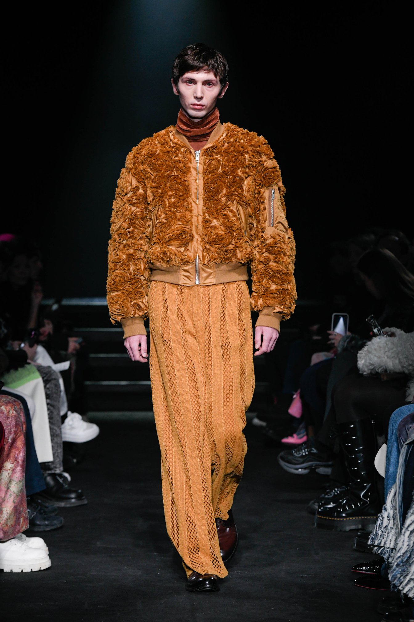 続いていた白と淡いグレーのカラーパレットは、オレンジのバラを敷き詰めたようなテキスタイルによって華やかに打ち破られる。インパクトのある素材だが、ボンバージャケットという見慣れたアイテムに仕上げられることで、依然としてウェアラブルだ。
