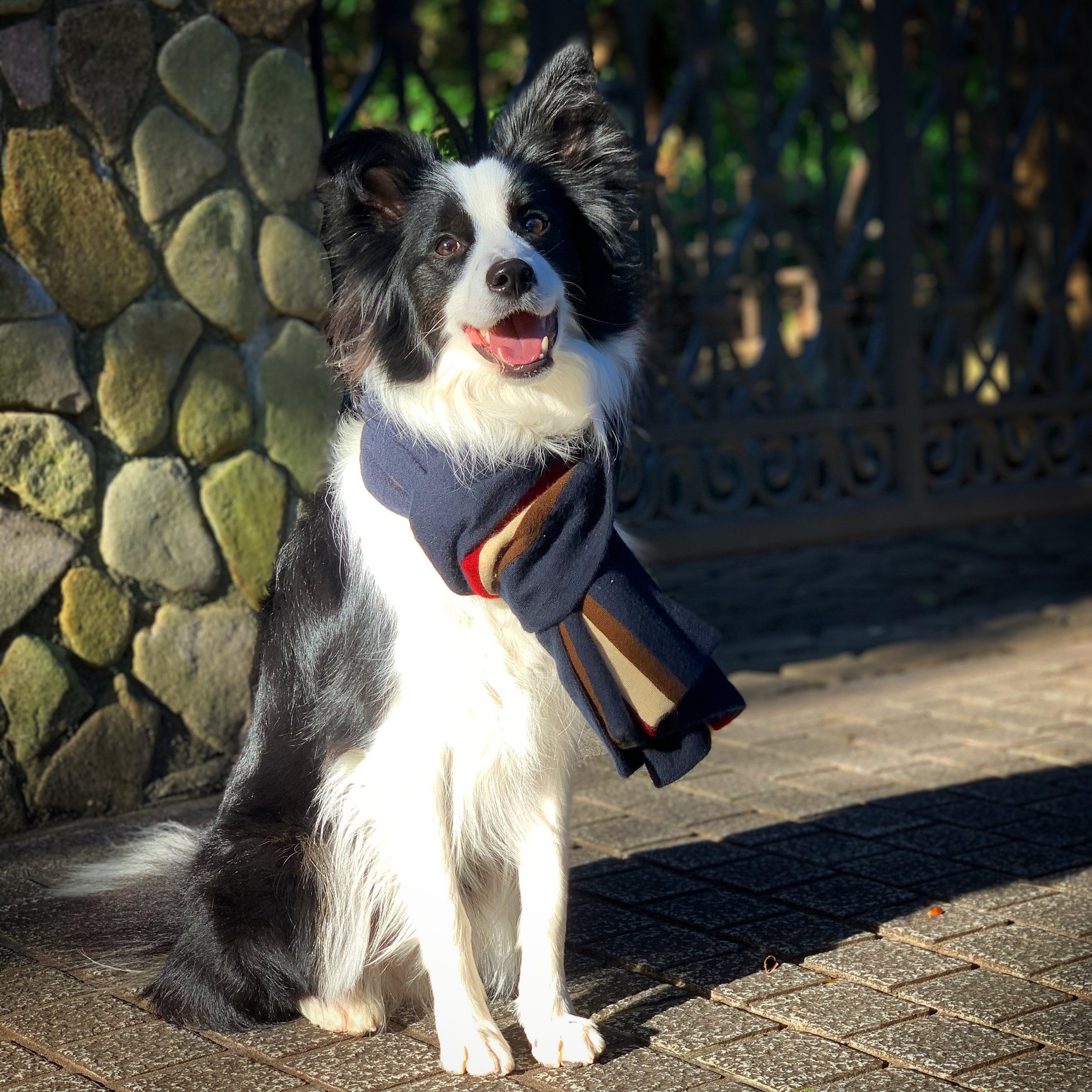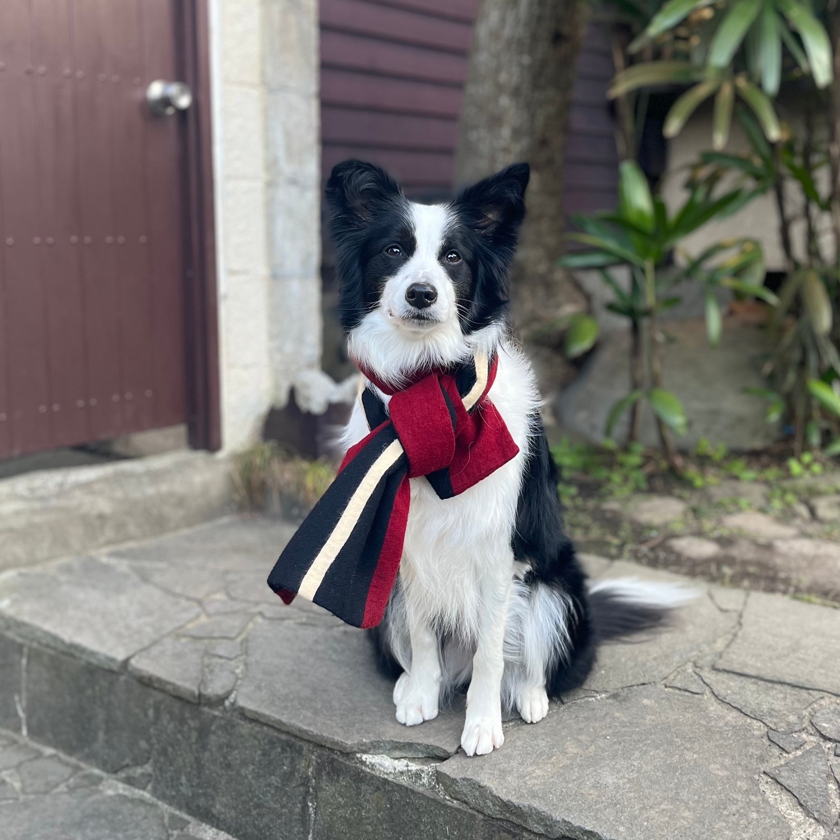 仁田:僕はボーダーコリーという犬種の犬を飼っているんですが、誕生日にドリスのスクールマフラーを着けて撮影するのが恒例行事になっているんです。その愛犬のケリーが今4歳で、4つ目を手に入れたところ。まだほかにもマフラーの種類があるので、毎年1つ買い足していく予定です。