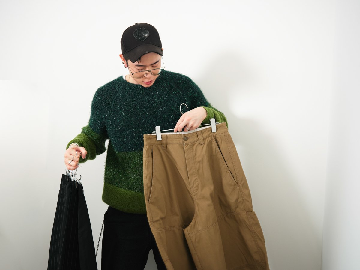 Taiki:まさにそこがお気に入りのポイントなんです。短すぎず長すぎずっていう。これがストレートな形だとハンパ丈みたいになって、シルエットがキマらないと思うんですよね。ハンガーラックに並んでるのを見た瞬間に「いいかも?」ってビビッときました。