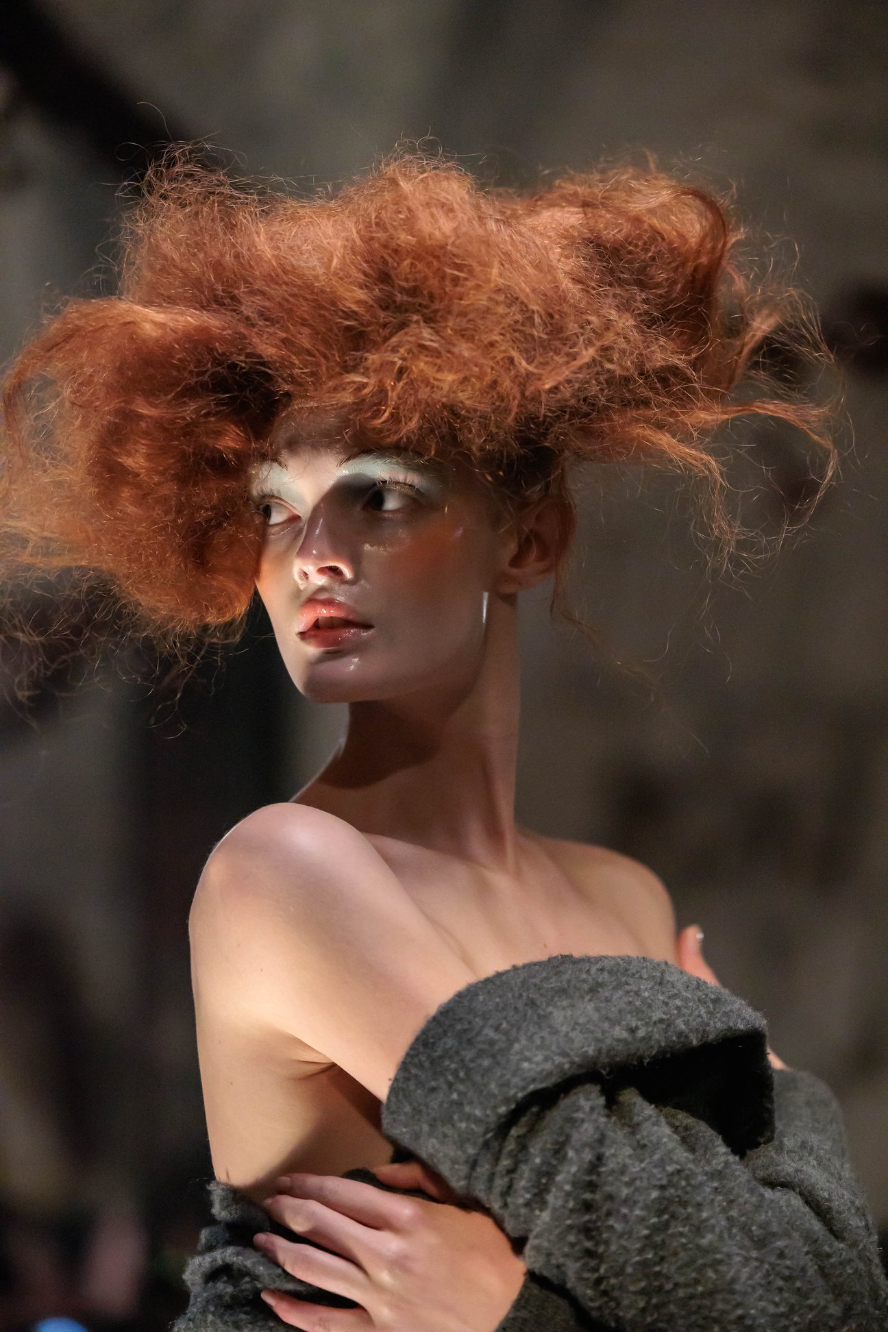 コルセットやシンチャーといった補正具が砂時計のようなシルエットを生み出し、オーガンザのドレスがモデルたちの胸元(時にマーキン=フェイクアンダーヘアも!)を露わにする。ヒップを大きく膨らませた古典的なフォルムは、100年の時の流れを飛び越える。また、雨に濡れたようなシリコン加工や、雨粒を表現したクリスタルの装飾などもドラマチック。生地が下から上へと劣化していく様を写し出したレトログレーディング(Retrograding)の技法も、年代物のドレスのような繊細な美を演出する。日に焼け、タバコや油で汚れたかと見まごう加工も施され、見過ごされがちな個性や出来事を衣服に投影した。
