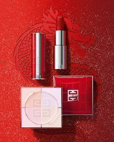 ジバンシイのリップスティック「ルージュ・アンテルディ・シルキー」とフェイスパウダー「プリズム・リーブル」が、クラシックなレッドと“ドラゴンの鱗”を彷彿とさせるモダンなクロコダイルパターンで彩られた限定パッケージに。ルースパウダーは明るいツヤと美しい透明感を与えてくれる限定カラー。