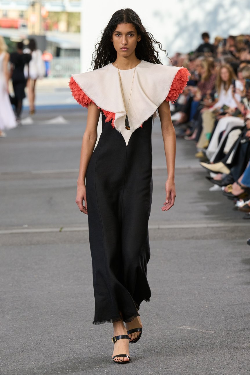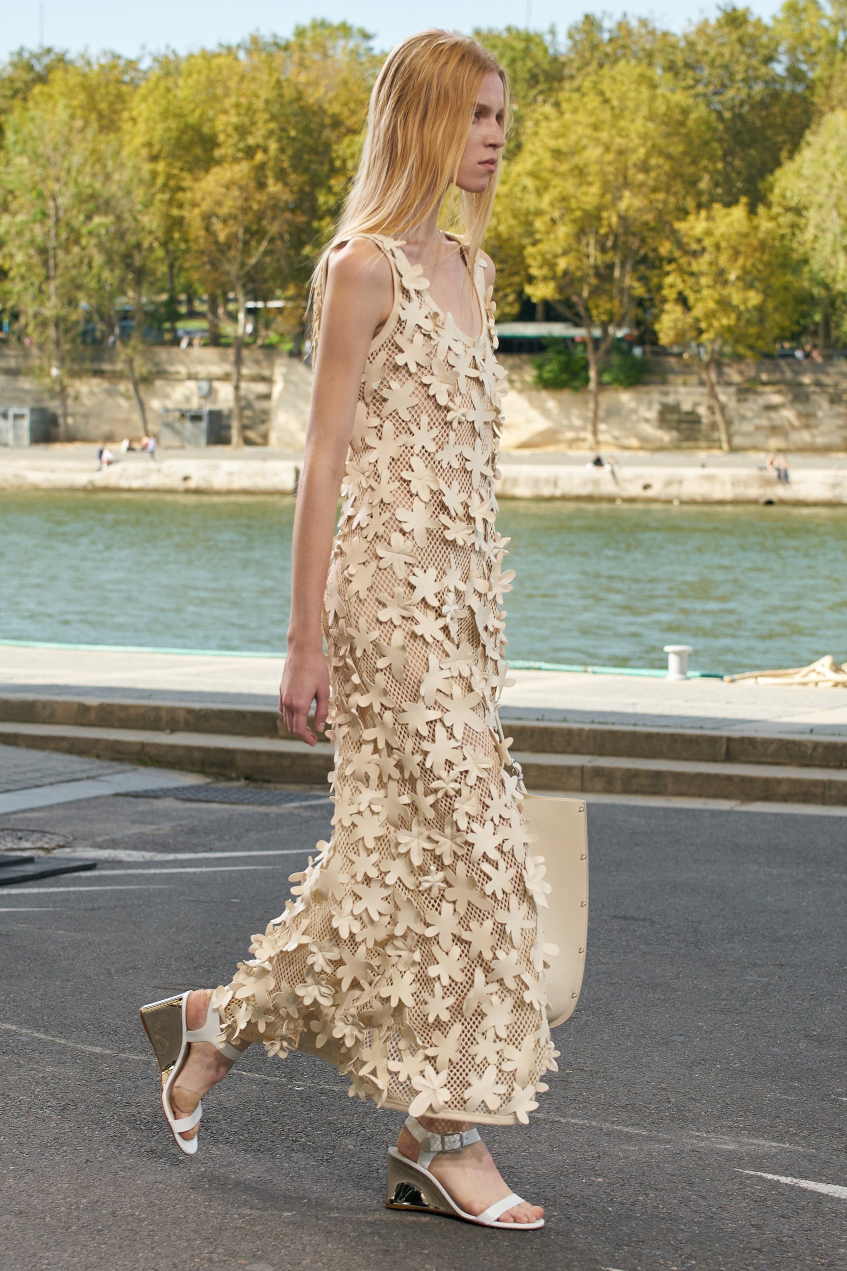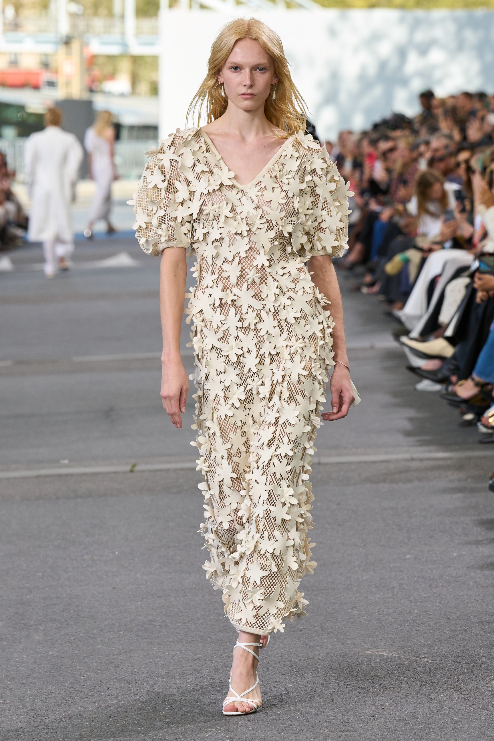 ギリシャ語で「クロエ」を直訳すると「若い緑の芽」という意味になるという。今回ガブリエラが着目したのは、重要な酸素供給装置でもあり、生命そのものの輝きを表現する草花のモチーフだ。花々の繊細で曲線的なシルエットを取り入れ、柔らかなドレープを描く花びらスリーブや、雄しべを思わせる何千ものビーズで飾られたタートルネックドレスなどが登場。革製の花をあしらったサマーサンダルや、フラワーモチーフのジュエリーなどもアクセントに加えられた。