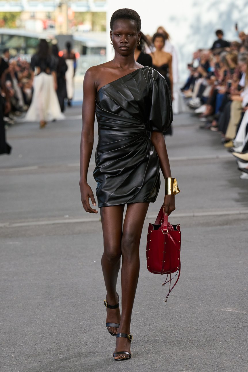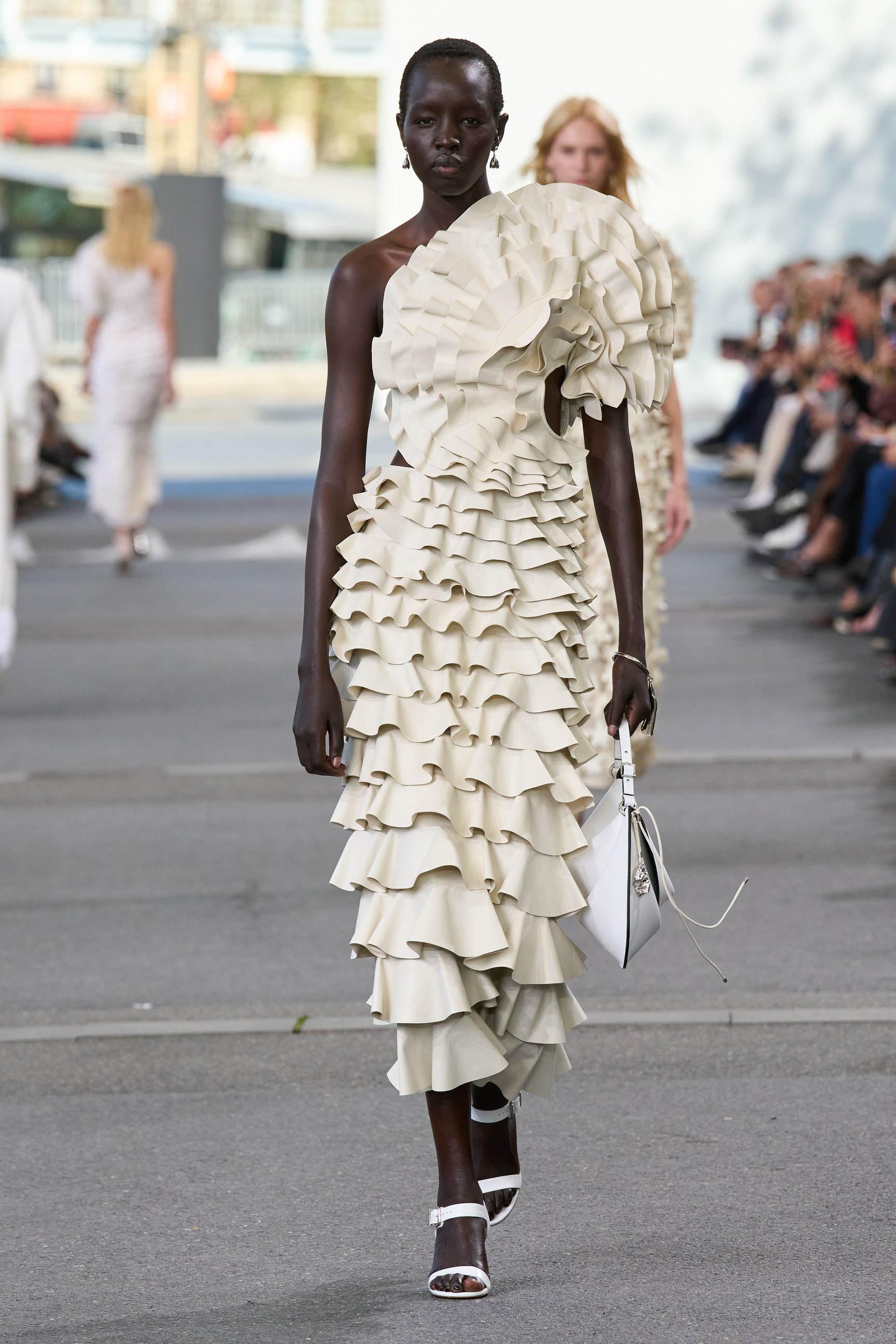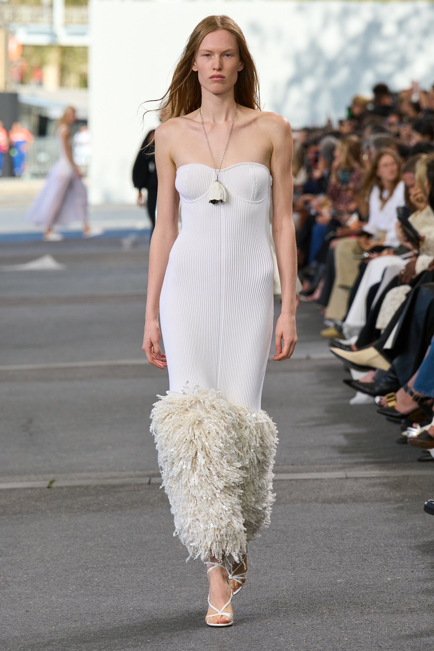 ギリシャ語で「クロエ」を直訳すると「若い緑の芽」という意味になるという。今回ガブリエラが着目したのは、重要な酸素供給装置でもあり、生命そのものの輝きを表現する草花のモチーフだ。花々の繊細で曲線的なシルエットを取り入れ、柔らかなドレープを描く花びらスリーブや、雄しべを思わせる何千ものビーズで飾られたタートルネックドレスなどが登場。革製の花をあしらったサマーサンダルや、フラワーモチーフのジュエリーなどもアクセントに加えられた。